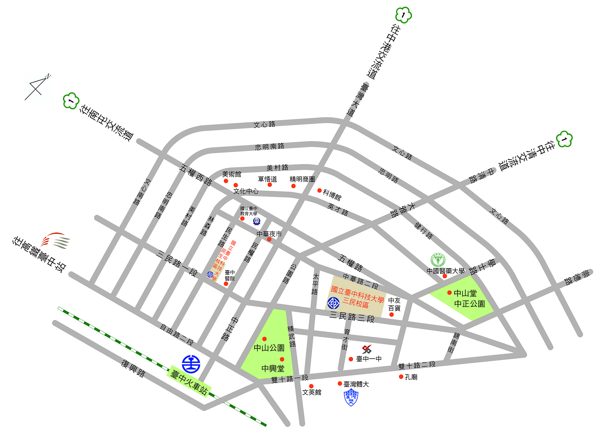 - 159高鐵快捷公車:高鐵台中站—中國醫藥大學—台中公園,於台中一中站下車再步行至「臺中科技大學」。