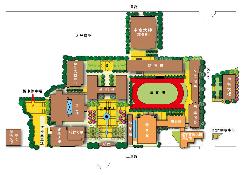 - 中清(大雅)交流道→下交流道→中清路→大雅路→(左轉)五權路→(右轉)中華路二段→本校中商大樓→本校區。