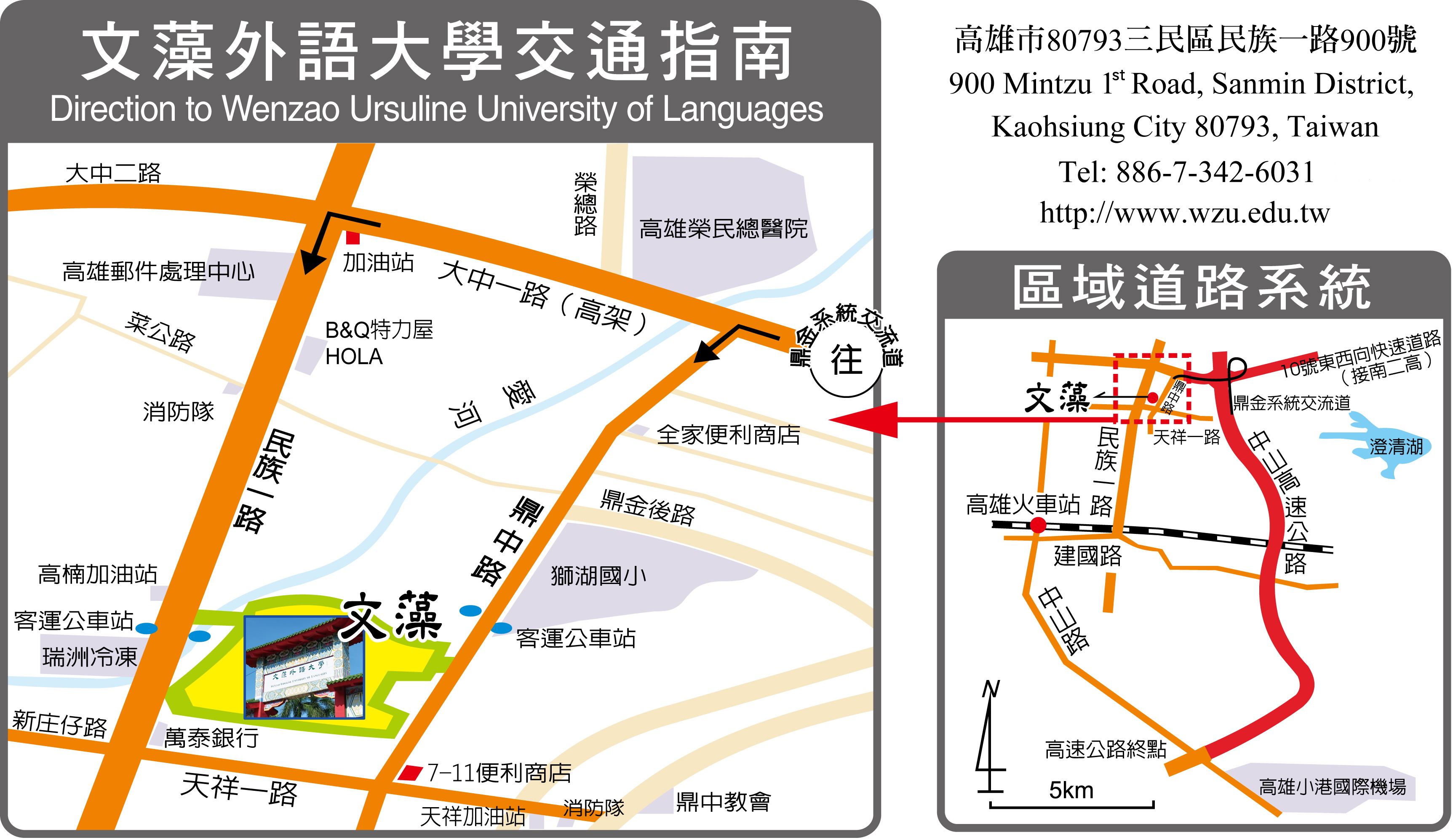 - 利用國道3號高速公路(南二高)者 : 轉入東西向10號快速道路往西之高雄方向於民族路出口下快速道路行經大中路,於民族路口左轉進入民族一路(台1線)直行約1公里即達本校。