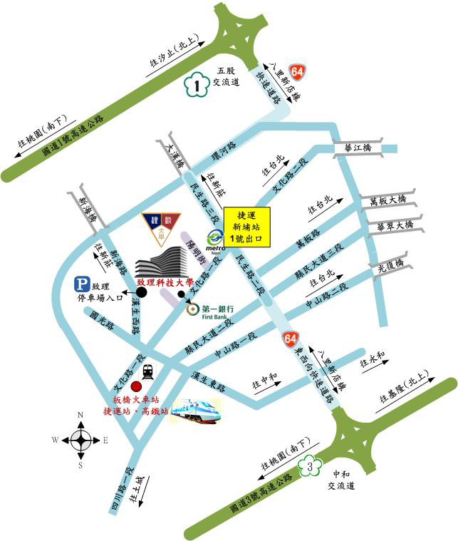 由南部北上經高速公路者,請走國道三號(北二高)中和交流道下,往板橋方向出口,接64號快速道路,往萬板路出口方向下橋,直行民生路至迴轉道迴轉往文化路方向,右轉文化路直行,即可到達。